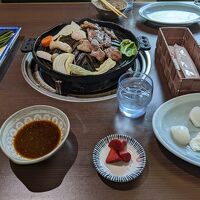蔵王温泉の郷土料理?はなぜかジンギスカン。 テラス席犬連れOKのカシェルの席がなくて、近くで見つけたお店宿。建物前に駐車場3台と足湯。建物1階がジンギスカン屋さん。犬は店に入れないので2人で代わり合って食べて良いですか?2人分注文しますから、とお願いして了承。外待ちは熱い足湯なので、足の裏だけ湯につけて待つ。店内は先の1人が二人分を焼いて先に半分食べる、にしました。 私はジンギスカンは大嫌いだったんですが、この店は臭みや癖がない、食べやすい柔らかい肉に美味しいタレ、食べられました。わらびの漬物を追加したら量が多くてビックリ。 お安くて美味しくて足湯付きなのでお勧めです。 宿は犬も泊まれるようです。こじんまりした家族経営みたいです。