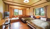 雄大な自然に囲まれた涌蓋山の麓で、温泉に浸かることができます。8種類の貸切風呂は、野趣あふれる大露天風呂をはじめ、高台に位置する展望家族風呂やサウナ付きの内湯、女性専用露天風呂などを完備。四季折々の山々を望める客室は、和室や掘りごたつ付きの和洋室などを用意しています。創業約160年の歴史ある館内は、囲炉裏を設えた情緒あふれる空間が広がっています。コーヒーや紅茶などのドリンクを用意しており、地獄蒸しで調理した温泉玉子をいただくこともできます。