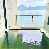 洞爺サンパレスに宿泊した際に知り、いつか泊まりたいと思っていました。今回は記念日ということで宿泊。テラスルームのプランを選択しました。部屋は縦に長く狭めでしたが、落ち着いた内装と座り心地の良いソファーや椅子があり、ゆっくり休めました。一番の目的の客室露天風呂は温泉ボタンを押すと15分ほどでお湯がたまり、滞在中3回入りました。ブラインドを閉めると風よけになり、開けると洞爺湖が見えて現実逃避には最高でした。夕食はサンパレス2階のしんりんダイニングでハーフビュッフェでした。オマール海老のブイヤベースがメインディッシュでしたが、刺身と一緒のメニューのため和風の鍋のほうが相性がいいと思いました。あまり食べず残してしまいました。そこだけが⭐︎0.5の残念ポイントです。他のビュッフェはメニューも多く、ライブキッチンもあり良かったです◎8階の大浴場はサウナがありジャグジー水風呂と痺れ水風呂と2種類の水風呂がありました。他の温泉は内湯と露天風呂のみなのでメインはサウナなのかもしれません。露天風呂は120センチの深湯と寝て入れる寝湯の2つあって貸切状態で入れて良かったです。虫がいる時期だと部屋のテラスや露天風呂は快適には過ごせなさそうなので今回この時期に行けて良かったと思いました。また泊まりに行きたいです。
