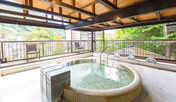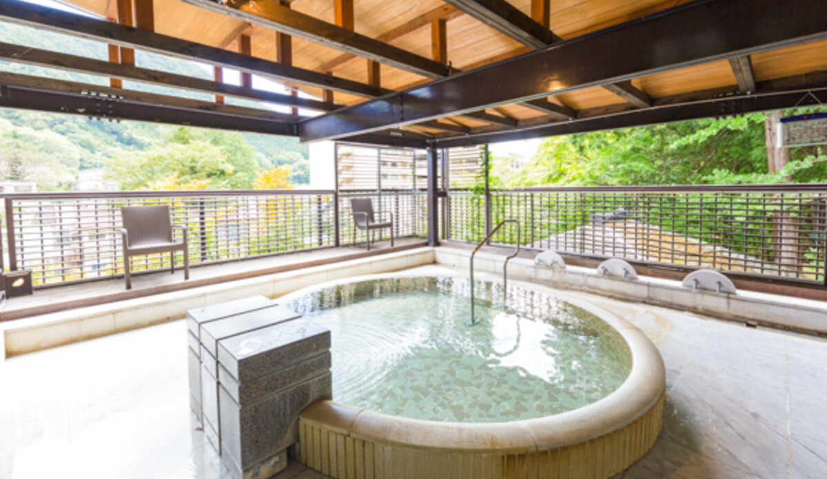 B1階にある2つの露天風呂。「表日光」の温泉はややぬるめの39度で、「奥日光」は岩に囲まれた浅めの温泉で適温40度です。