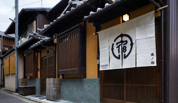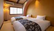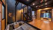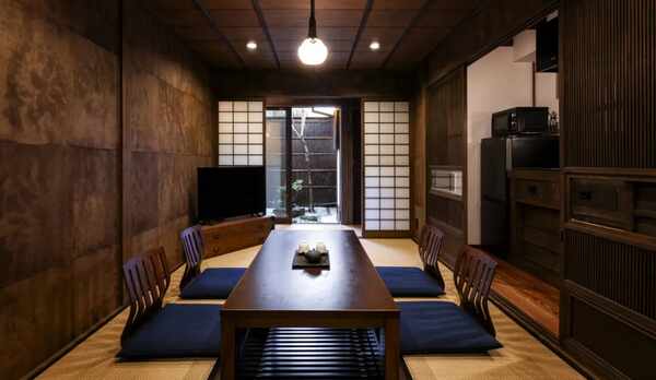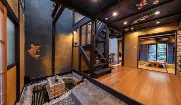 瓦屋根の上で小さな守り神に見守られているような、一棟貸しの京町家。室内には、縁起の良い「ひょうたん」の照明や輪つなぎの唐紙、打ち出の小槌など「吉」にまつわるモチーフが散りばめられています。1階には情緒あふれる坪庭に面した和室を、2階にはベッドを配した寝室を用意。充実した設備を揃えたキッチンや、洗濯機なども完備しており、京都の街に暮らすように滞在することができます。嵐電四条大宮駅・阪急電鉄大宮駅より徒歩約3分、JR京都駅より車で約12分。嵐山への観光拠点に便利なロケーションです。