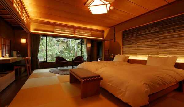 貴船神社鳥居前に佇む「貴船ふじや」は、創業当時より続く川魚料理が魅力の旅館です。厳選された旬の食材と川魚を使った京料理を、季節によっては川床でいただくことができます。客室は落ち着いた雰囲気の和室となっており、開放的な窓からは眼下に貴船川の渓流を、目の前に四季折々表情を変える自然の景色を臨むことができます。大浴場には貴船石を使用した野趣感じる岩風呂と、ステンドグラスと赤レンガの壁が異国情緒を演出する大理石風呂を完備。どちらも貴船の湧水を利用した湯に浸かることができます。