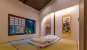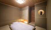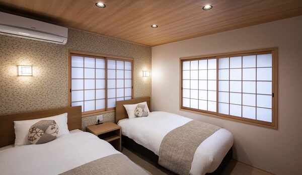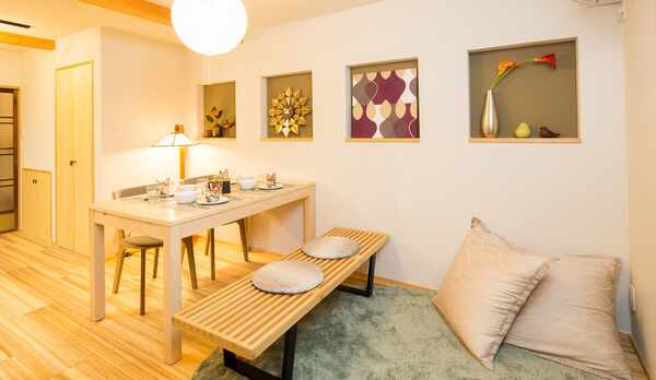 八坂の塔の麓にひっそりと佇む京町家。暖簾をくぐり建物に足を踏み入れると、白木で統一された空間に「金閣寺」と「銀閣寺」になぞらえてゴールドとシルバーを散りばめた、上品な和の空間が広がっています。室内には、和モダンな設えのリビングをはじめ、シングルベッドを2台配置した洋室や、布団を備えた和室などがあります。冷蔵庫や電子レンジなどを備えた簡易キッチンや、長期滞在に便利な洗濯機などの設備も充実しており、京都の街に暮らすように過ごすことができます。町家までは、京阪「清水五条駅」より徒歩約15分。周辺には「清水寺」や「建仁寺」などがあり、観光にも便利なロケーションです。