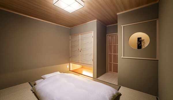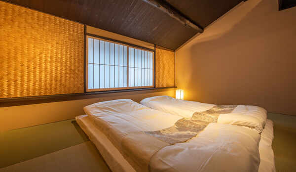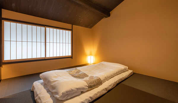 「八坂の塔」の麓に佇む1棟貸しの町家。客室は、白木で統一した内装に、シルバーやゴールドの装飾を散りばめた上品な和の空間。1階には、畳の香りが広がる和室や、坪庭を望む小窓付きのバスルーム、電子レンジや冷蔵庫を備えた簡易キッチンがあります。長期滞在にも便利なドラム式洗濯機も設置しており、暮らすように滞在することができます。2階には、ベッドを2台配した洋室と布団を備えた和室を用意。町家までは、京阪「清水五条駅」より徒歩約15分。周辺には「清水寺」や「建仁寺」などがあり、観光にも便利なロケーションです。