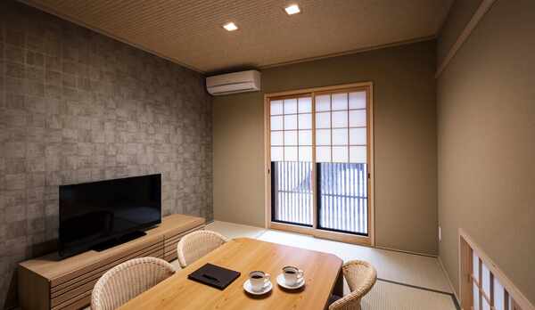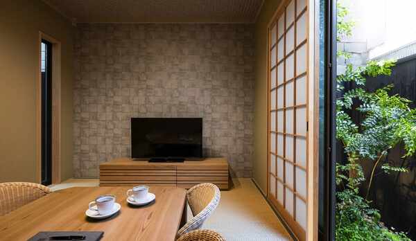 閑静な住宅街に佇む京町家に一棟貸切で宿泊することができます。1階には、ベッドを配した洋室や広々とした和室、坪庭を臨むダイニングなどを用意。調理器具・食器類を揃えたキッチンには、IHコンロや魚焼きグリル、電子レンジなどを完備しています。長期滞在に便利な洗濯乾燥機や、空気清浄機も設置。Wi-Fiも利用可能です。2階には、和室を2室用意しています。JR京都駅より車で約10分、祇園にも徒歩で向かうことができるロケーションです。