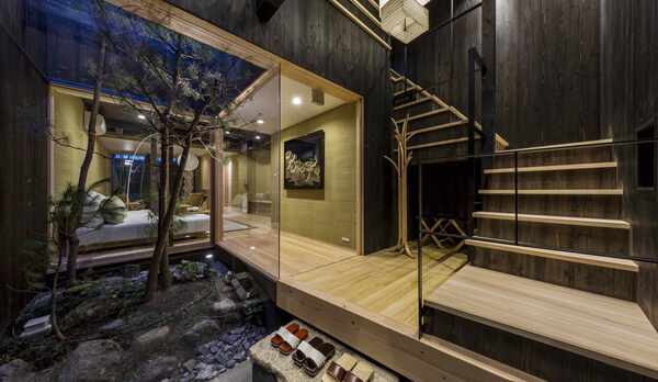 地下鉄烏丸線「五条駅」より徒歩約4分。京都の街並みに溶け込むように佇む、1日1組限定の宿泊施設。伝統的な京町家を、スペースを有効活用するために多層空間にリノベーション。格子戸や梁などが残る和の空間に、スタイリッシュなインテリアを設えたモダンな空間です。敷地内には、季節ごとに表情を変える坪庭を併設。1階には坪庭を望むバスルームを、中2階にはキッチンやダイニングを完備。中2階と2階に、それぞれ広めのベッドを配した寝室を備えています。夕食は、旬の京都食材をふんだんに使用した特製弁当を用意。朝食は焼き立てのパン、または和朝食をいただくことができます。