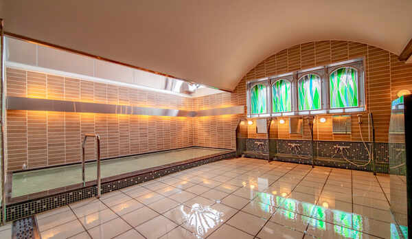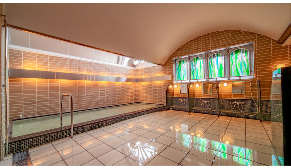 大浴場は「水の湧き出る泉」をテーマとした男性用と、「緑豊かな森」をテーマとした女性用の2種類があります。それぞれ大小3つの浴槽があり、ジェットバスも完備されています。男性大浴場はブルーを基調とし、シンプルでモダンなデザインが特徴。大きな浴槽は岩肌から湧き出る泉のようにライトグレーに輝きます。女性大浴場はグリーンを基調とし、温かみのあるデザイン。森の中の砂岩をイメージし、カラフルな浴槽からジェットバスのバブルが湧き出ています。ステンドグラスと円形窓からの自然光が温かさをさらに引き立てます。
