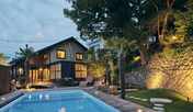 淡路島の豊かな自然を満喫できる1日1組限定の貸別荘。内風呂や露天風呂を完備しており、岩屋温泉の湯につかりながら心癒やされる時間を過ごすことができます。2階建ての客室は、床や壁などにダークトーンの木材を使用した落ち着きのある空間。薪ストーブを配したリビングをはじめ、ダイニングキッチンや4室のベッドルームがある間取りです。屋外プールやBBQを楽しめるテラスも備えています。敷地内にはすし処「神の前」を併設。夕食は、目の前で職人が握る寿司やお造りなどを用意。淡路近海で獲れた新鮮な魚介類を堪能することができます。