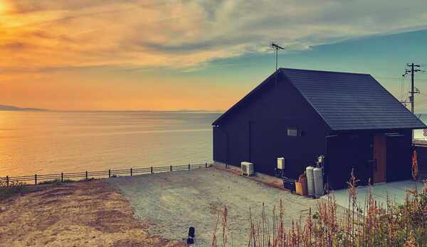 淡路島の西海岸に位置する、オーシャンフロントの一棟貸しの貸別荘。建物に足を踏み入れると、梁が目を惹く高天井の開放的な空間が広がります。落ち着いた色調のインテリアで統一された室内には、大きな窓から広大な瀬戸内海を望むリビングをはじめ、無垢材のテーブルを配したダイニングや調理用具を揃えたキッチン、ベッドと布団を備えた寝室などがあります。リビングに併設されたウッドデッキバルコニーでは、刻々と変化する海や水平線に沈む夕陽を眺めることができます。敷地内には、海風を感じながら食事を楽しめる屋根付きのBQQスペースを用意。貸別荘までは、北淡ICより車で約20分です。