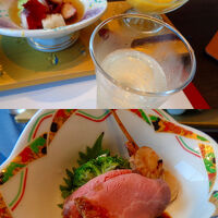 今日のお宿は「北アルプスを望む露天風呂の宿 ひがしだて」という二度と復唱できなそうな長ーーい名前のホテルです(苦笑) お部屋はセミダブルのツインベッドルーム、そしてーー。 ロッキングチェア風の椅子とマッサージチェアのある和室。 そして、何と言っても東館山を望める半露天風呂のある浴室です。 24時間掛け流しの温泉が楽しめます。 当たり前ですが眺望は抜群。 このホテルの名前「ひがしだて」はダテに付けていないわけです(笑) しかし、このホテルにチェックインして驚いたのは!! 宿泊客は我々夫婦だけとのこと! 数十室ある大きなホテルですが、お盆明けはメチャ空いているようです。 露天風呂はそれほど広くありませんが眺望は最高! やはり自室と同じで東館山が望めます。 大浴場と部屋付き露天風呂の両方を楽しみ、冷蔵庫にある無料のビール、ジュースなどを楽しんでいると夕暮れになります。 食事は個室で頂きます。 前菜からいっぱいあり、最終的に食べきれないほどのお料理でしたが、どれもおいしかったです。 朝食も質も量も十分でした。 再訪したいオススメの宿です。