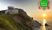 三方向に広がる日本海を眼下に望む、全室露天風呂付オーシャンビューの「ホテルノイシュロス小樽」。「ニセコ積丹小樽海岸国定公園」内の雄大な自然に囲まれた立地です。大浴場では、紅色に染まる海や朝陽に輝く水面など刻々と変わる景色を眺めながら檜や岩造りの温泉に浸かれます。夕食は創作フレンチのフルコースで、新鮮な海の幸や契約農家で栽培された野菜など地産地消にこだわったメニューを味わえます。6階にある展望デッキからも、晴天の日は遥か積丹半島まで続く「積丹ブルー」と呼ばれる大海原やその夕景を一望することができます。