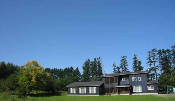 大自然の中にぽんっという感じであるペンション。床の無垢材がとても足に気持ちよく、リラックスできました。残念ながら雨だったので星空は見えなかったのですが、北海道の美味しいごはんに大きな2匹の猫。黒い猫はくまちゃん。サビ柄はキキちゃん。夕食後にナデナデさせていただきました。 部屋の窓から見える景色は最高で、ちょうど牧草を刈り取るシーズンで、黄緑色の上に黒い牧草ロールがてんてんと置かれている景色は美術館の庭のように美しかったです。 朝、庭の向こうの牧草地に丹頂鶴が2羽やってきました。また是非、今度は星空を見たいです。