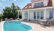 南房総の海沿いに佇む、愛犬と過ごせる一棟貸しの宿泊施設。西洋風の建物に入ると、リゾート感あふれる空間が広がっています。房総の海を一望できるテラスやプールを併設。打ち寄せる波の音や心地よい海風を感じながら、くつろぎの時間を過ごせます。室内には、大きな窓や吹き抜けが開放感のあるリビングをはじめ、趣の異なる3つのバスルーム付きベッドルームや、調理器具や食器類を揃えたキッチンを完備。フードボウルやトイレシートなどの愛犬用アメニティも充実しています。オプションで利用できるBBQセットがあるので、プールサイドでのBBQを楽しむことができます。