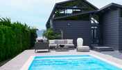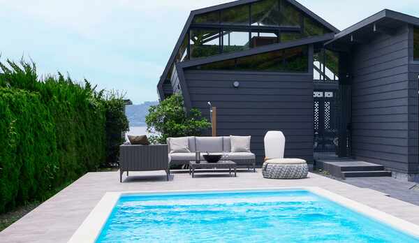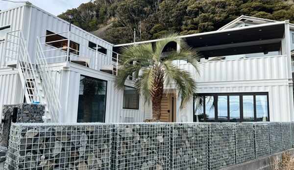 コンテナを組み合わせて作られた、南国感漂う貸別荘。富津金谷ICを降りてすぐ、房総半島に位置しています。敷地内には、約8mの温水プールやBBQを楽しめるテラスがあり、心地よい風を感じながら優雅なひとときを過ごせます。また、サウナや露天風呂も完備。タイルをふんだんに使用した室内には、グレーを基調とした開放的なリビングやこだわりのコアラスリープ製マットレスを採用した寝室、調理器具や食器類を揃えたキッチンを用意。リビングの大きな窓からは、クルーザー越しに見える東京湾を眺めることができます。プロジェクターをはじめ、電子レンジや電気ケトル、炊飯器などの設備も充実しているため、暮すように滞在することができます。