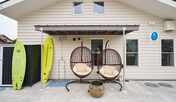 JR「安房鴨川駅」より車で約9分の、ペットと宿泊可能な一棟貸し切りタイプの宿泊施設。室内には、日が降り注ぐアイランドキッチンとダイニングをはじめ、広々としたリビングルームや4台のベッドを配した屋根裏部屋のようなベッドルームを用意。木を基調としたナチュラルテイストな空間で、ゆったりとした時間を過ごすことができます。ダイニングには4台のIHコンロがあり、最大約10名で鉄板BBQを楽しめます。洗濯機やオーブントースター、電子レンジなどの設備も充実。真っ白なタイルが印象的なバスルームとパウダールームには、ReFa製のシャワーヘッドやヘアドライヤーを備えています。外には、シャワーや2台のハンギングチェアを完備。ビーチまで徒歩約30秒と、サーフィンや釣りなどのアクティビティを満喫することができます。また、徒歩約5分の場所にある貸し切りサウナも利用可能です。