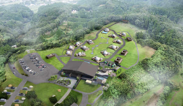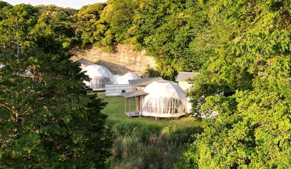 豊かな自然に囲まれたグランピング施設。客室は、リビングと寝室が分かれたツインタイプのドームテントや、屋根付きテラスを備えた広々としたコットンテント、古材を使用した木の温かみあるタイニーハウスなど用意。全棟にキッチンやトイレ、エアコンなどを完備。屋外には、BBQスペースや焚火台を併設しており、夕陽に染まる空や満天の星を眺めながらくつろぎの時間を過ごせます。夕食はBBQを、朝食はベーグルなどを味わうことができます。敷地内には、ドリンクを揃えたカフェスペースや、レトロな雰囲気が漂う駄菓子屋を併設しています。
