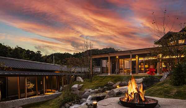 希少な黒湯を贅沢に楽しめる露天風呂や内風呂、大浴場やサウナ、水風呂を完備した温泉施設が魅力の宿。JR大原駅から車で約12分、都心から約90分の距離で、喧騒を離れた非日常を楽しむことができます。古民家を再生したプライベート空間の一棟貸し客室は温泉やプールが備わっており、全室に薪ストーブ付きのプライベートヴィラや快適なグランピングスタイルのドームテントなど多彩な選択肢があります。また、愛犬と一緒に泊まれる客室も用意されています。房総の新鮮な海の幸をふんだんに使った食事は、オーベルジュスタイルのレストランや季節のおすすめコースなど、多彩な味わいを堪能することができます。敷地内には、小川のせせらぎが心地よい庭園やアロマトリートメントスパ、夏季には屋外プールもあり、贅沢なひとときを過ごすことができます。