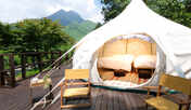深い森や由布の山々などの大自然に囲まれたグランピング施設。⾃然との境⽬を極限までなくした全面ガラス張りの「光の箱」や、半露天風呂を完備したオーバル型テント、陽の光が差し込むドーム型テントなどを用意。愛犬と一緒に宿泊できるテントも揃えています。シモンズ製ベッドや北欧風の家具をしつらえており、冷暖房・Wi-Fiを完備しています。夕食は、アウトダイニングでいただくフレンチや、BBQディナーを味わうことができます。敷地内には、開放的な温泉浴場や広々としたドッグラン、落ち着いた雰囲気のバーなどを併設しています。
