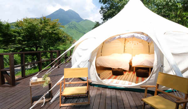 湯布院の雄大な自然に囲まれたグランピング施設。敷地内には、由布院温泉を堪能できる温泉大浴場を併設しています。ウッドデッキ上に配置された客室は、ナチュラルなデザインのベルテントや広々としたドームテントを用意。専用温泉風呂付きのドームテントも揃えています。全室に、冷暖房をはじめ、冷蔵庫や電気ケトル、ハンモックなどを設置。BBQ専用テントも備えており、新鮮な地産食材を使用したBBQを楽しむことができます。朝食はホットサンドを中心とした洋食のセットメニューです。施設までは、JR「由布院駅」から車で約6分。周辺には「金鱗湖」や「湯の坪街道」があります。