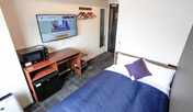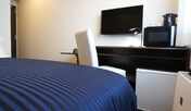 部屋は狭いですが、テーブル椅子があり使いやすいです。椅子やベットからもテレビ見れます。使い捨てスリッパ、アメニティはフロントでとるタイプ、パジャマは上下セパレート、照明はリモコン、コンビニ直結が◯です。梅田駅からはちょっと歩きます。