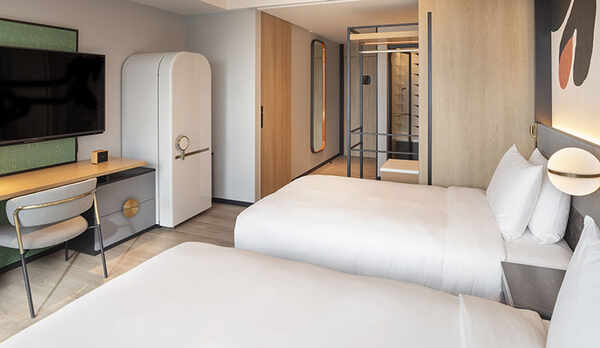 梅田スカイビル・新梅田シティまで徒歩約2分のホテル。全室バス・トイレが独立した客室は、広さ約40㎡のスタンダードフォースと約45㎡のデラックスフォースを用意。家族連れやグループにでの利用にも適しています。ホームシアターを楽しめるプロジェクター付きのシーリングライトを完備し、フランスベッド製のマットレスを採用。Wi-Fiを利用できるほか、電子レンジや電子ケトルなども設置しています。館内には、長期滞在などにも便利なコインランドリーや、荷物を預けられるロッカーを完備しています。
