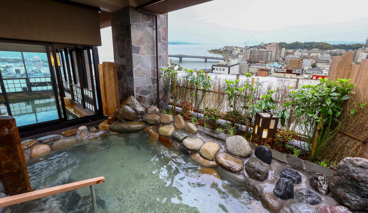 最上階11階にある男女別の温泉大浴場「だんだんの湯」。開放感あふれる広々とした内湯に、宍道湖を望める露天風呂のほか、セルフ式ロウリュサウナが備わっています。