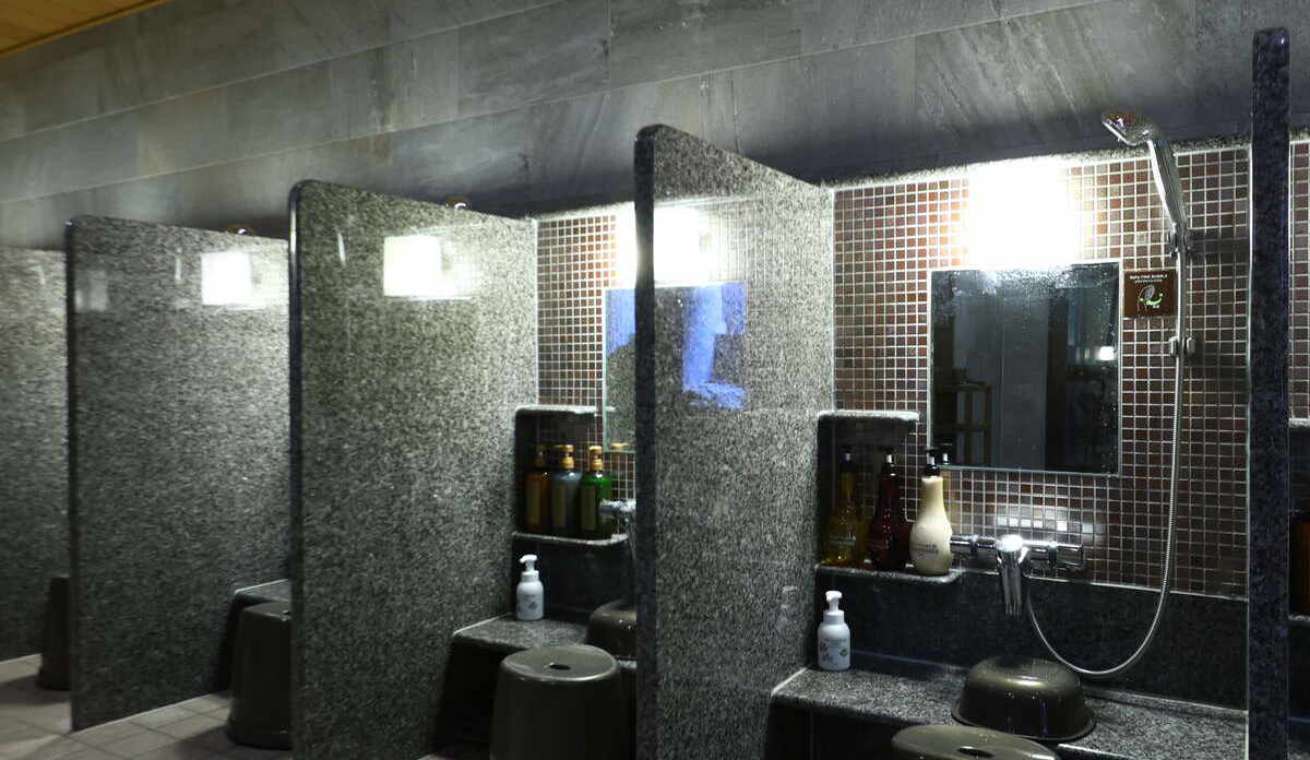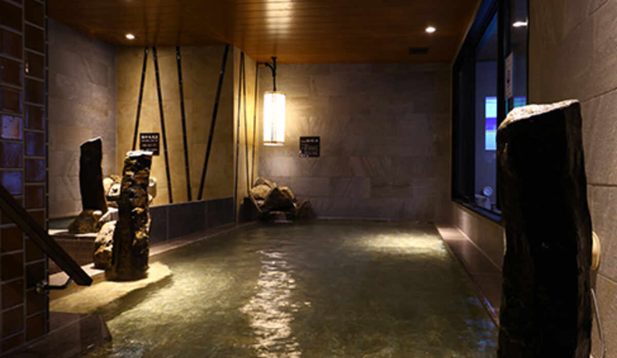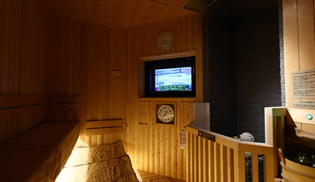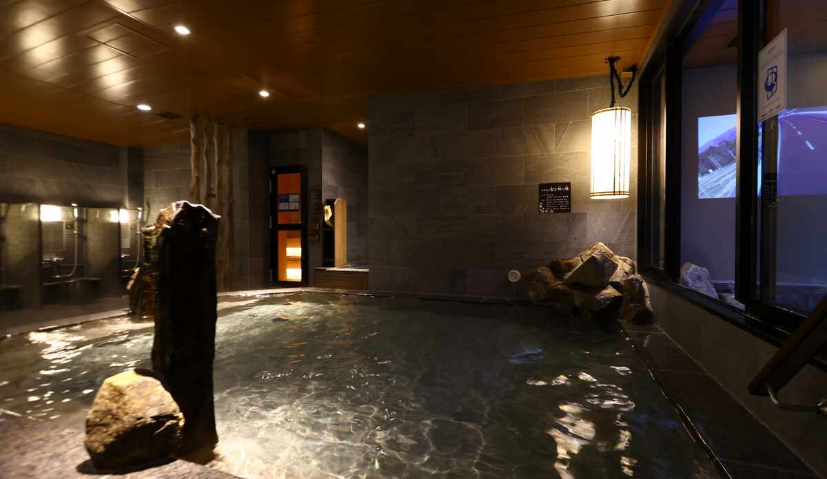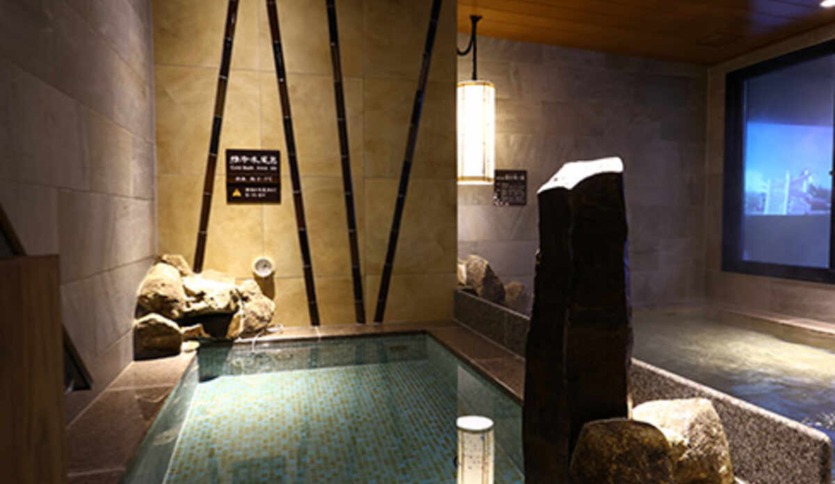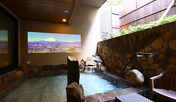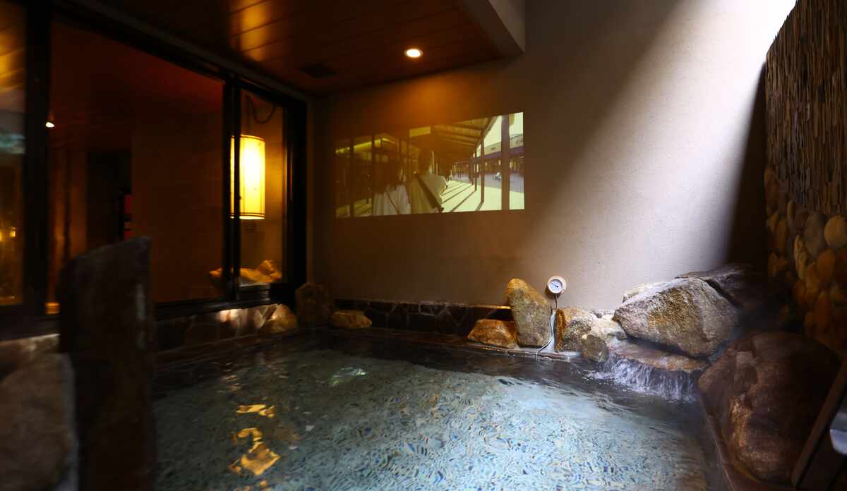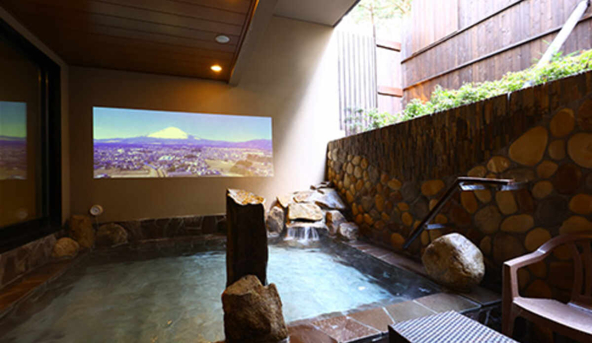 ドーミーイン初のセルフロウリュサウナを設えた大浴場。半露天風呂では御殿場の観光地、富士山の四季などがプロジェクターで放映されています。