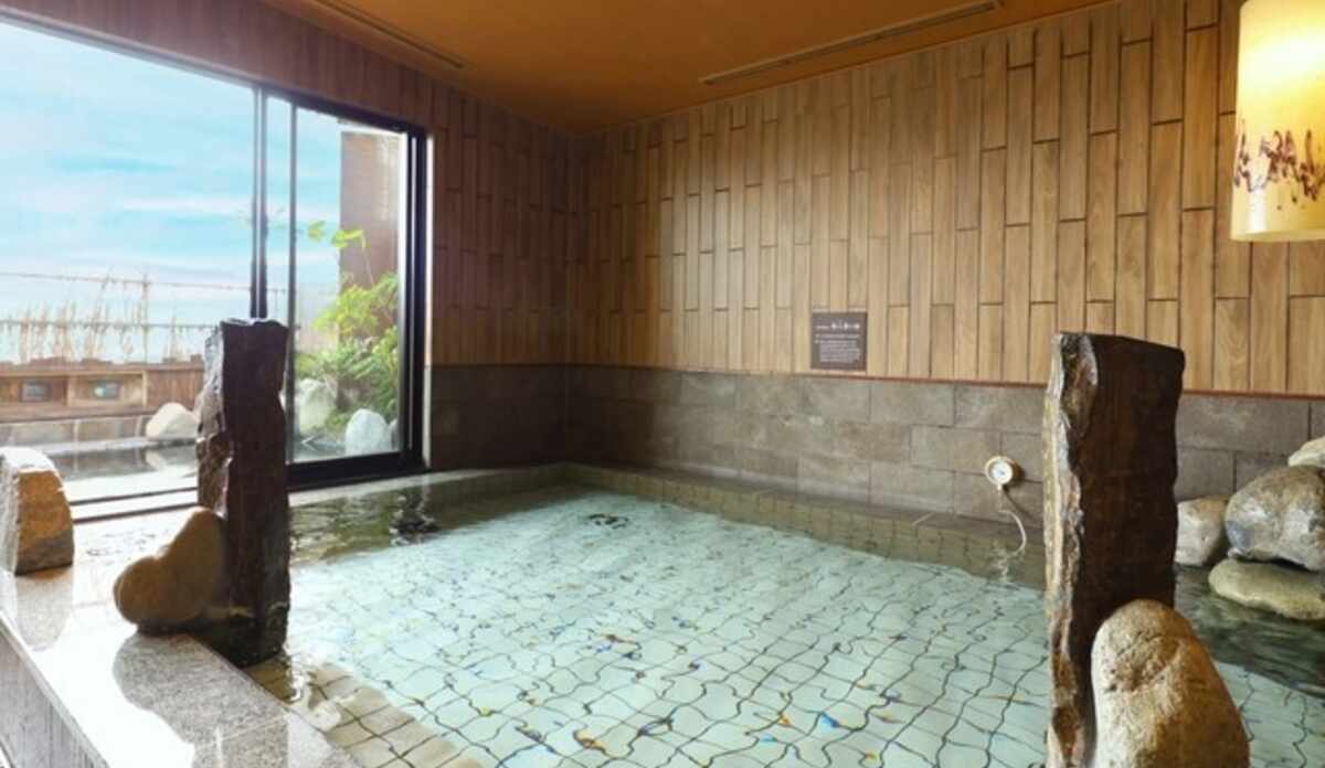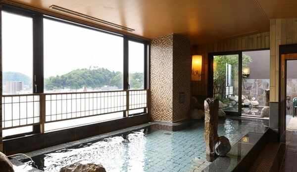 最上階9階にある男女別の温泉大浴場。露天風呂からは、九頭竜川水系日野川の支流である「足羽川」が一望できます。