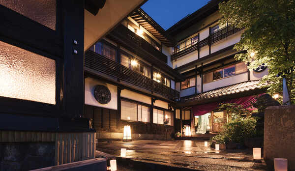 ノスタルジックな雰囲気が魅力の老舗旅館。数寄屋造りの館内は、全館畳敷きの心地よい空間です。レトロモダンなインテリアを配し竹久夢二の作品などが飾られています。石垣から湧出した温泉に浸かれる木造の玉子型風呂や露天風呂などを併設。夕食は、山形牛や「米の娘ぶた」など地元の食材を使用した創作会席料理です。大正ロマンあふれる客室には懐かしさを感じる家具を配し、和室や畳敷きにベッドを配した和室などを用意。周辺には、共同浴場が充実しています。
