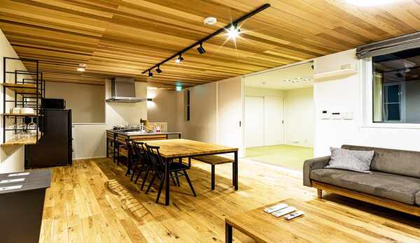暮らすように滞在できる一棟貸しの宿泊施設。約6名まで宿泊可能な客室は、広さ70㎡のゆとりある3LDK。全室に、調理器具や食器類を揃えた3口コンロのキッチンを完備しており、好みの食材を持ち込んで自炊を楽しむことができます。室内には、木目を基調とした温かみのあるデザインのリビングダイニングや、畳の香りが広がる和室、フランスベッド製マットレスを採用した寝室などを用意。映画鑑賞を楽しめるプロジェクターや、長期滞在にも便利な洗濯機も設置しています。周辺の、図書館を併設した「萩中央公園」まで徒歩約3分、城下町ならではの街並みが残る「菊屋横丁」まで車で約3分のロケーションです。