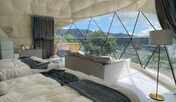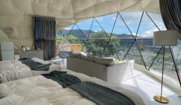河口湖や富士山を一望できるロケーションが魅力のグランピングリゾート。Wi-Fiや調理器具、BBQグリル付きのウッドデッキを備えたキャビン・グランピングテントを用意しています。キャビンにはオリジナルの木製二段ベッドを備え、マットレスはサータ製を採用しています。プロジェクターで映画鑑賞も。グランピングテントは2台のセミダブルベッド・暖房器具を完備。食事は、地元食材を盛り込んだBBQやホットサンドの朝食をいただくことができます。敷地内にはフィンランド風のバレルサウナを併設。
