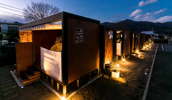 秘密基地のようなプライベート空間が広がるキャビン型の宿泊施設。客室は、ピンクのソファを設えた「SAKURA」や、随所にグリーンをあしらった「FOREST」、壁面に描かれた富士山が目を引く「FUJI」など、全6タイプを用意。全室に、オーブンレンジやミニ冷蔵庫を備えたミニキッチンや、ダブルベッドを配したロフトを完備。ジェットバスを完備した客室も揃えています。デイベッド付きのウッドデッキでは、星空を眺めながらBBQを楽しむことができます。チェックイン棟には、コインランドリーやセルフクロークなどを設置。最寄りのスーパーやコンビニまで徒歩約7分のロケーションです。