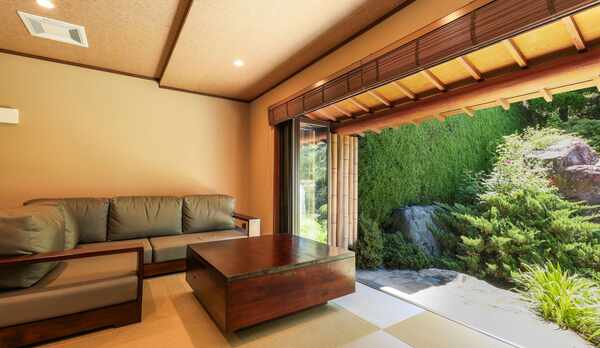 全室に専用温泉風呂を完備した、愛犬と過ごせる旅館。四季折々の美しい庭園を眺めながら、プライベート空間で温泉を楽しむことができます。全室スイート仕様の客室は、コンパクトかつ機能的な「桜」をはじめ、広々とした「萩」、2階に位置し眺望に優れた「牡丹」の全3室を用意。日本庭園の一画には宿泊者専用のドッグランを併設しており、自然の中で愛犬との時間を満喫できます。食事は、目の前で焼き上げる甲州牛の溶岩焼きを中心とした会席料理です。旅館までは、JR「石和温泉駅」から車で約5分、一宮御坂ICより車で約10分。敷地内には駐車場を完備しています。
