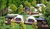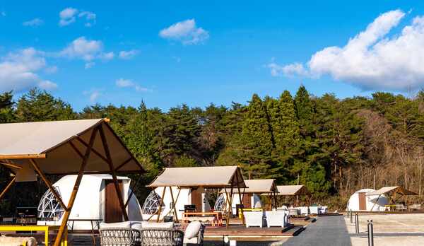 標高約900mの高原にある湖の畔に佇むグランピング施設。鳥の声や草木の香りに包まれる自然豊かなロケーションです。敷地内には、大浴場や24時間利用できるシャワールームを完備。保古の湖でのカヌーやSUP体験、テントサウナや焚火を利用したコーヒー豆焙煎・マシュマロ焼きなど、アウトドアならではのアクティビティも魅力です。こだわりのインテリアが施された直径約6mのドームテントは、エアコン・冷蔵庫完備で通年快適に過ごすことができます。各棟には個別のBBQスペースや焚火台も用意され、夕食はプライベートデッキにて岐阜県恵那エリアの新鮮食材を使用したシェフこだわりのグランピングBBQディナーをいただくことができます。グランピング中央部分には特大のファイヤーピットが設置されており、夕刻、豪快な炎を眺めながら食事を楽しむことができます。名古屋市内や豊田市内より車で約1時間半と、東海エリアからのアクセスも良好な立地です。