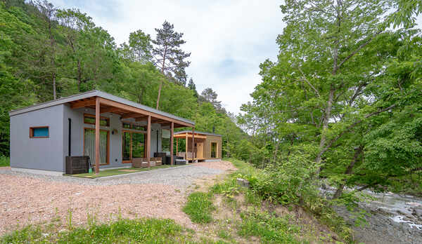標高約1,000m、森や川に囲まれた1,500坪の敷地内にひっそりと佇む隠れ家のような宿泊施設。客室は、建築家の遊び心が随所に散りばめられたデザイナーズ空間。室内には、暖炉を設えた温かみあるリビングをはじめ、無垢材の囲炉裏テーブルを配したダイニングや、大きな窓から陽の光が差し込む寝室などを用意。屋外には、岩露天風呂付きの「せせらぎテラス」や、小さな滝を望む「滝見テラス」、半露天風呂や寝室につながる「星見テラス」などの4つのテラスがあります。川のせせらぎや心地よい風に包まれながら、心癒やされる時間を過ごすことができます。