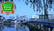 JR松江駅~徒歩15分:②③⑥番バス乗場で6分大橋北詰下車!松江大橋左に聳える「白い時計台」が当館。山陰道松江西~10分
