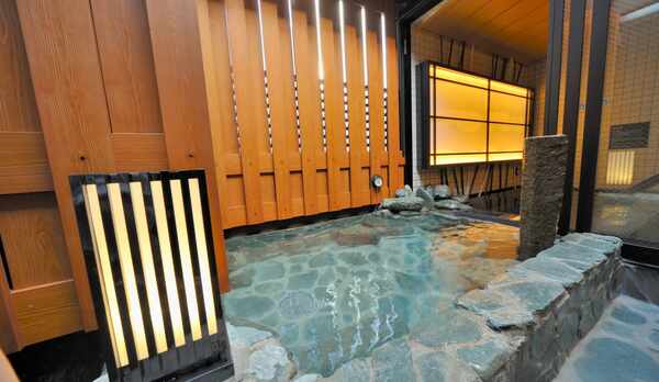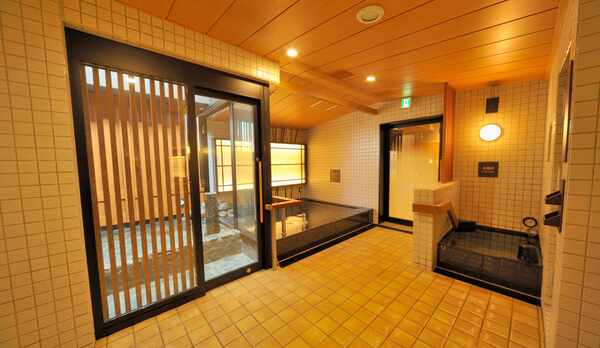 ホテル最上階の12階に位置する、半露天風呂付きの男女別大浴場「徒士の湯」。高温ドライサウナや水風呂なども備わっています。