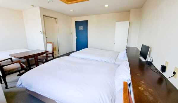 トリプルルームと駐車場無料と検索しこちらのホテルを選択。トリプルルームがあるビジネスホテルは少なく、あっても1つはソファベッドになることが多いのですが、今回の部屋はダブルベッド1つとシングルベッド2つの部屋でした。湯呑みやコップなどは4つあったので定員4名の部屋なのかもしれません。ホテルの写真で見ても広そうな部屋でしたが部屋の奥にダブルベッド、手前にシングルベッド2台、中央にソファーとテーブル、メイクができるテーブルと壁付き鏡、足が伸ばせる浴槽、一人暮らし用の冷蔵庫、横幅1メートル以上のクローゼットなど完備されていてとても過ごしやすい部屋でした。残念なポイントとしてはバストイレが同じなことと、ダブルベッド側の壁にテレビがあってソファーからは遠くて見づらかったことですね。建物は外観も内装も昭和レトロな雰囲気で古めでしたが清掃が行き届いて綺麗で毎日清掃にも入ってもらえて良かったです。