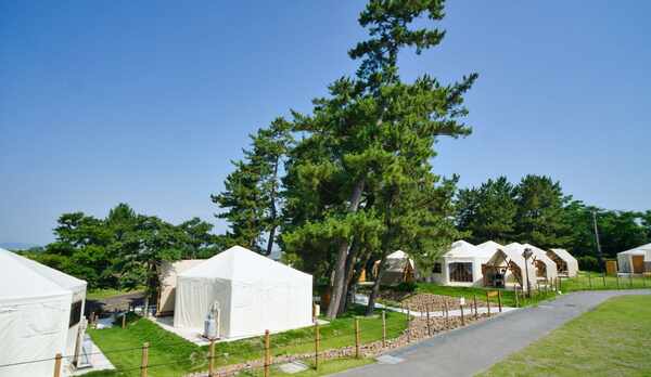 愛知県瀬戸市に位置し、愛・地球博記念公園より車で約3分の場所にあるレジャー施設。グランピング・BBQ・物つくり体験などが楽しめ、日本の昔懐かしい日常文化に触れることができます。グランピングエリアには、2~3名用のグランピングテントのほか、1日1組限定でドッググランピング利用もできる3〜5名用のグランピングテントを用意。テント内は、Wi-Fiや充電コンセント、エアコンや冷蔵庫、トイレやバスルームなどの設備が完備され、快適な時間を過ごすことができます。夕食では、絹姫サーモンのホイル焼きや川魚の串焼きなどの地産の川鮮食材を堪能できるメニューや、瀬戸豚や瀬戸山麓牛などのお肉中心のメニューが用意されており、気分や好みに合わせたBBQが楽しめます。名古屋中心部からは約40分の立地で、合掌作りの家をシンボルに自然に囲まれながらアウトドア体験が楽しめる施設です。