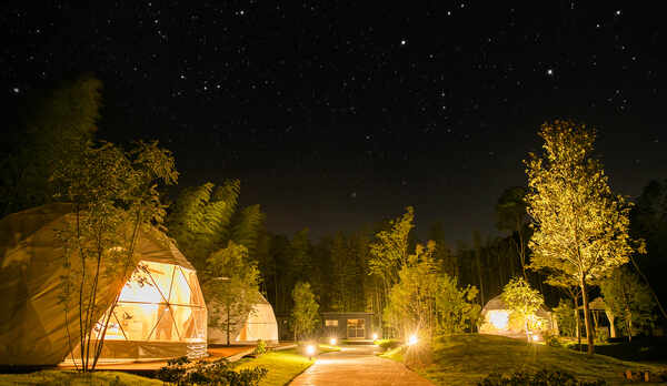 竹林に囲まれたアウトドア複合施設。客室は、ウッドデッキ付きのドームテントを用意。ブルーのファブリックが目を引く「MARINEスタイル」と、落ち着いた色合いで統一された「MODERNスタイル」の2タイプを揃えています。各棟に、トイレやシャワー、冷暖房などを完備。BBQコンロも設置しており、知多牛や知多の魚介を使用したBBQを楽しむことができます。敷地内には、電源付きのキャンプサイトや焚火スペース、いちご狩りを楽しめる「イチゴハウス」を併設。竹灯籠作成体験や五右衛門風呂体験などアクティビティも充実しています。施設までは、美浜ICより車で約10分のロケーションです。