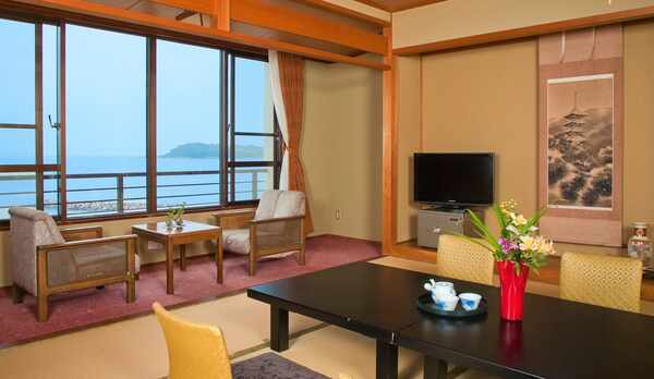 「西浦温泉 ホテル龍城(たつき)」に1泊しました。 駐車場はホテルエントランス前で広々としています。 エントランスではチェックイン手続きを行い、その後全国旅行支援の手続きを別コーナーで行いました。 全体的にスタッフの数は多めです。 お部屋は、4階和室10畳オーシャンビュー(洗面、トイレ、UBあり)でした。 清潔に普通レベルで掃除されておりましたが細かい点汚れがありました。 冷蔵庫内は自分たちで掃除しました。 夕食は懐石コースで普通レベルでしたが、 特に御飯のアサリ釜飯ご美味しかったです。量はちょうど良かったです。 お風呂は内風呂、露天風呂に分かれています。内湯の湯船内床の健康石らしいものが邪魔です。 アメニティは乳液などありました。 全国旅行支援やクーポンを使い、休前日でリーズナブルでしたが、2度目はないです。
