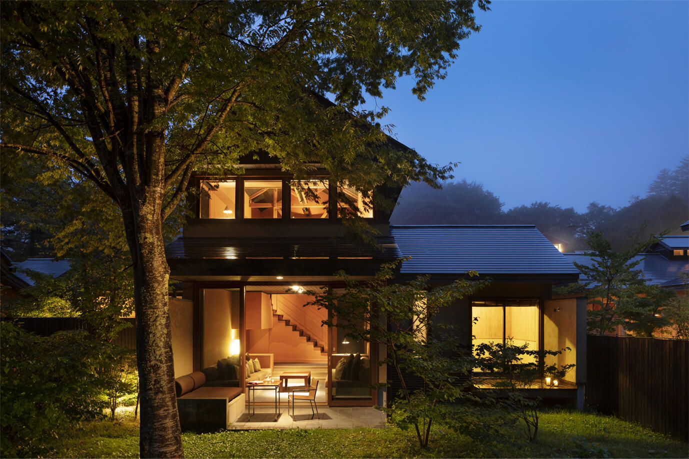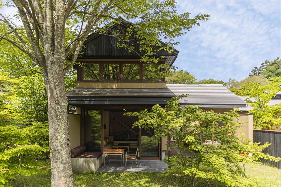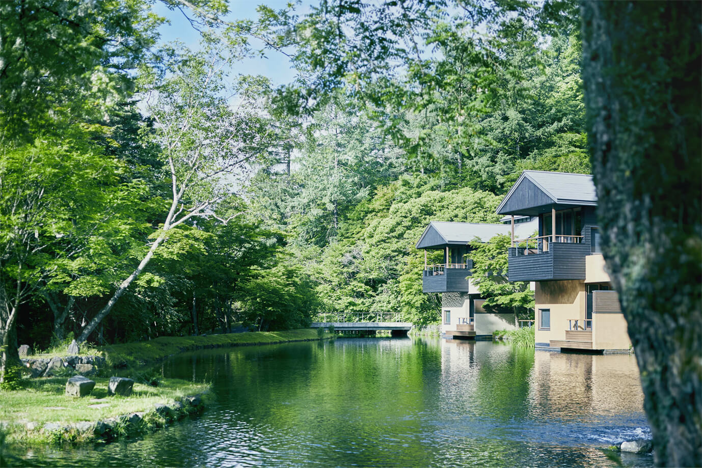 「谷の集落」の山側に位置し、心地よい緑に包まれながら静かな時間を過ごすことができます。客室は、1階と2階に用意。窓の外の木々が枝葉を広げる1階の客室は、森の風景や路地を渡る風を身近に感じられる心地よい空間。眺望のよい2階の客室は、四季折々表現を変える「軽井沢野鳥の森」をテラスや浴室から望むことができます。客室タイプはツイン・キング・トリプルを揃えています。
