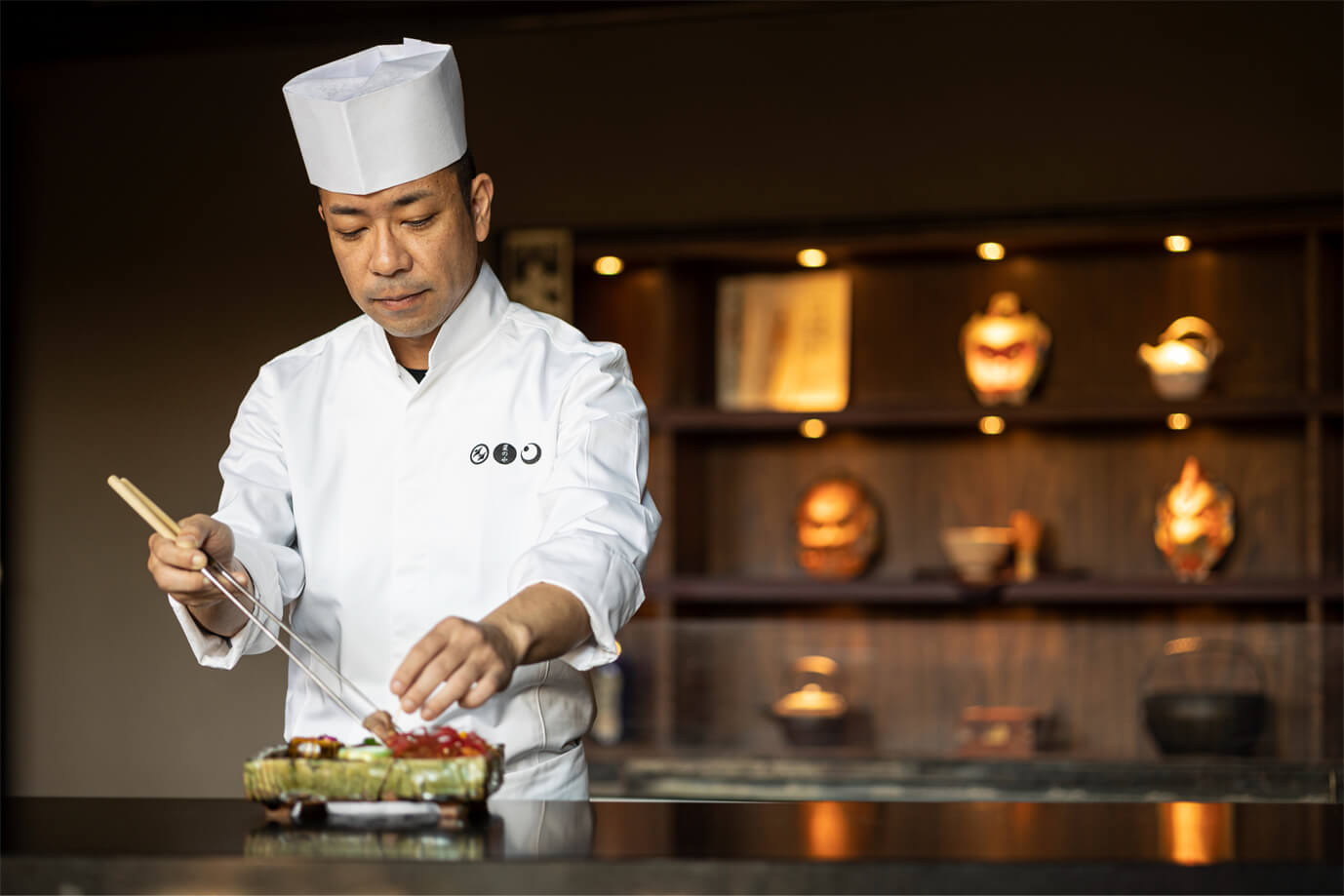 信州の滋味といえば、山菜や高原野菜、きのこ、ジビエ、川魚などが挙げられます。「日本料理 嘉助」では、土地の素材が持つ可能性を最大限に引き出したいという思いから、素材本来の旨味が引き立つ調理法を駆使し、皿の上で軽井沢の季節のうつろいを表現しています。