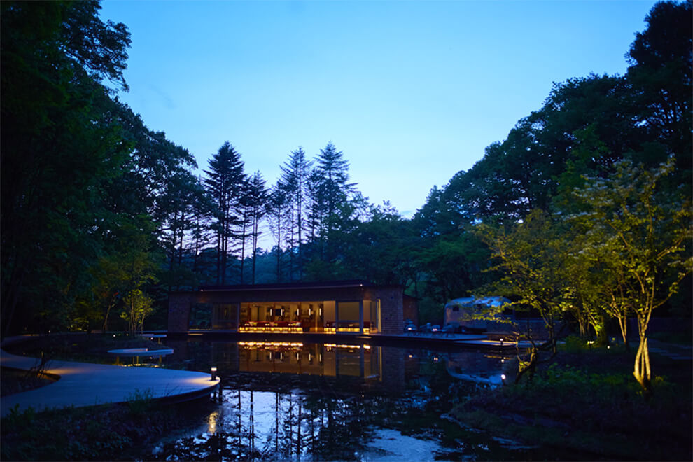 ケラ池のほとりに佇む「森のほとりCafe&Bar」では、お酒や珈琲などをいただくことができます。自然と一体化した夜の森の神秘的な空間の中で、読書をしたり団らんを楽しんだりと、思い思いの時間を過ごすことができます。