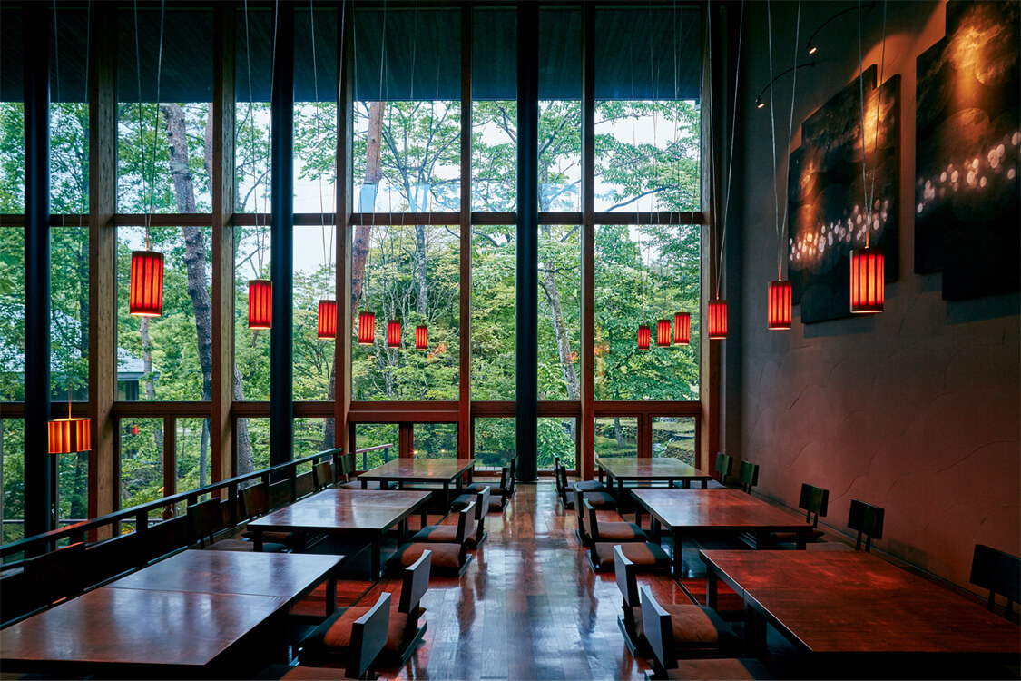 「星のや軽井沢」では宿泊と食事を分けた料金体系「泊食分離」のスタイルをとっています。メインダイニング「日本料理 嘉助」や「ブレストンコート ユカワタン」、季節の食材を使ったメニューを楽しめる「村民食堂」やカジュアルなレストランが並ぶ「ハルニレテラス」などを揃えており、その日の気分に合わせた食事を楽しむことができます。また、客室でゆっくりといただくことができる部屋食のメニューも用意しています。