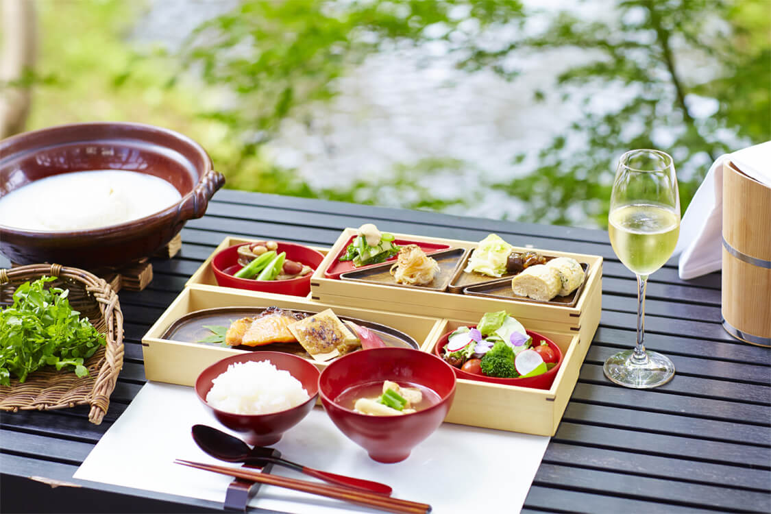 朝は、数種類の野菜の栄養が溶け込んだ野菜出汁を味わう「山の朝食」を用意。食材を丸ごと摂りこむ「一物全体食」の考えの下作られた、体にやさしい朝食をいただくことができます。また、部屋食で楽しむことができるメニューには、釜炊きご飯と特製のお味噌汁、焼き魚などの「和朝食」と、オムレツやパンなどが並ぶ「洋朝食」などを揃えています。