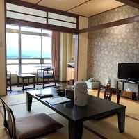 古さは否めないですが昔ながらの観光旅館で風情がありました。外湯露天風呂と貸し切り風呂も楽しめます。湯上がりはお肌がつるっと良いお湯でした。リーズナブルなのに夕食は部屋食で量も多く大満足。旅館のすぐ側に建つ神社の小路を抜けると加茂湖が一望できるスポットがあり夕方、朝と2回も行ってしまいました。