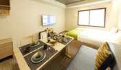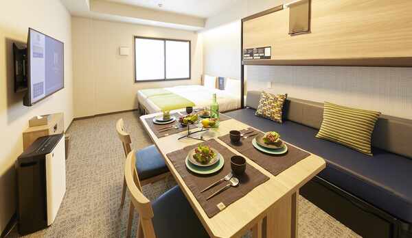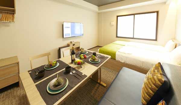 東京メトロ日比谷線入谷駅より徒歩約6分のアパートメントタイプのホテル。客室には、IHキッチンを設置し、電子レンジや調理器具も完備しています。キングベッドを配したスタンダードキングルームや、畳の小上がりを設えたジャパニーズルームなどを用意。全室約30㎡以上のゆとりのある広さとなっており、自宅のようにくつろぎの時間を過ごすことができます。長期滞在にも便利な大型冷蔵庫や掃除機、乾燥機付き洗濯機を設置しています。朝食は、日替わりの洋食プレートか和洋食プレートなどをいただくことができます。