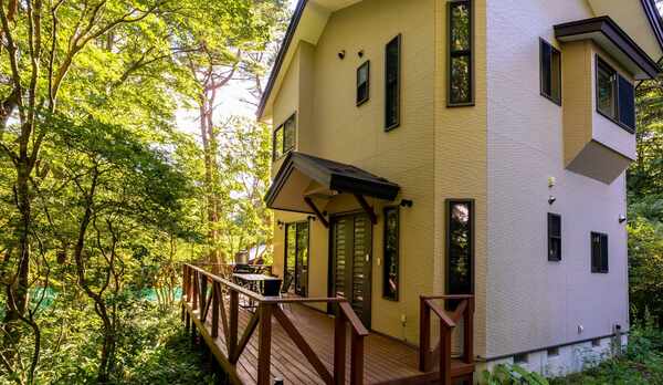 那須湯本の別荘地に位置する、1日3組限定の温泉宿泊施設。木のぬくもりが広がる客室は、ゆとりあるメゾネットタイプの和洋室。吹き抜けの高天井や自然光が差し込む大きな窓が印象的で開放感ある空間となっており、くつろぎの時間を過ごすことができます。産地直送の食材にこだわった食事は、景色を楽しめる一面ガラス張りのダイニングにて用意。夕食は、那須黒毛和牛の鉄板焼きをはじめ、八戸漁港から直送される新魚や那須の高原野菜を使用したコース料理を味わえます。館内には、内風呂と露天風呂を備えた2つの貸切風呂を完備。四季折々の風景を眺めながら、高雄温泉の湯につかることができます。