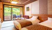 塩原渓谷に佇む、全室温泉風呂付きの旅館。四季折々に変化する渓谷の景色を眺めながら、温泉に浸かることができます。野趣あふれる岩造りの露天風呂をはじめ、薬湯座風呂やシルキーバスなどを備えた大浴場を完備。趣の異なる3種類の貸切露天風呂もあります。和を基調とした客室は、ツインやフォース、和洋室などを用意。豊かな自然に囲まれた離れ客室も揃えています。夕食は、旬の地元の味覚をふんだんに使用した、彩り豊かな会席料理をいただくことができます。朝食は、やさしい味わいの和食です。館内には、くつろぎスペースやマッサージ処を併設。旅館までは、JR「那須塩原駅」より送迎を行っています。